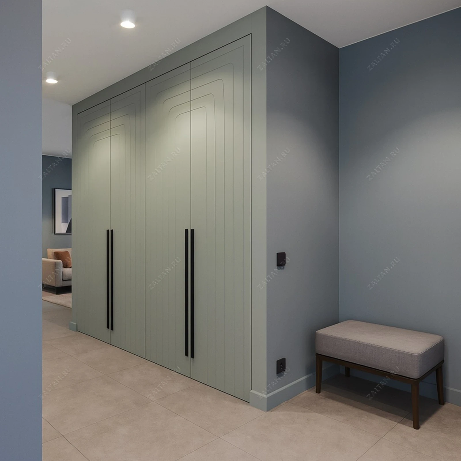 Элегантный встроенный шкаф в прихожую, выполненный под заказ. Фасад из МДФ с матовой покраской нежно-зелёного оттенка и фрезеровкой в виде аккуратных арок — современная интерпретация скандинавского минимализма.