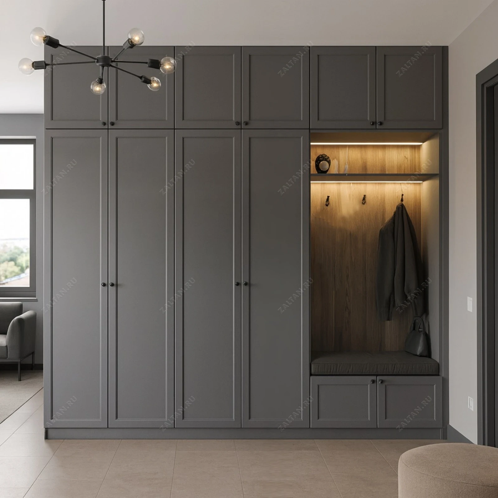 Элегантный встроенный шкаф премиум-класса для прихожей — выполнен под потолок в глубоком сером матовом оттенке. Встроенная ниша с подсветкой, крючками и мягким сиденьем обеспечивает удобство при переодевании, а нижние секции с ящиками скрывают обувь и мелочи.