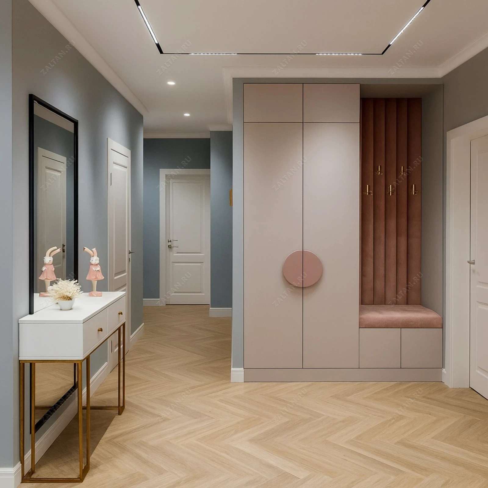 Компактная встроенная прихожая премиум-класса: высокий шкаф с антресолью, мягкая вертикальная спинка и сиденье, выдвижные ящики под банкеткой и скрытые крючки. Идеально для узкого коридора — бережно хранит верхнюю одежду и обувь.