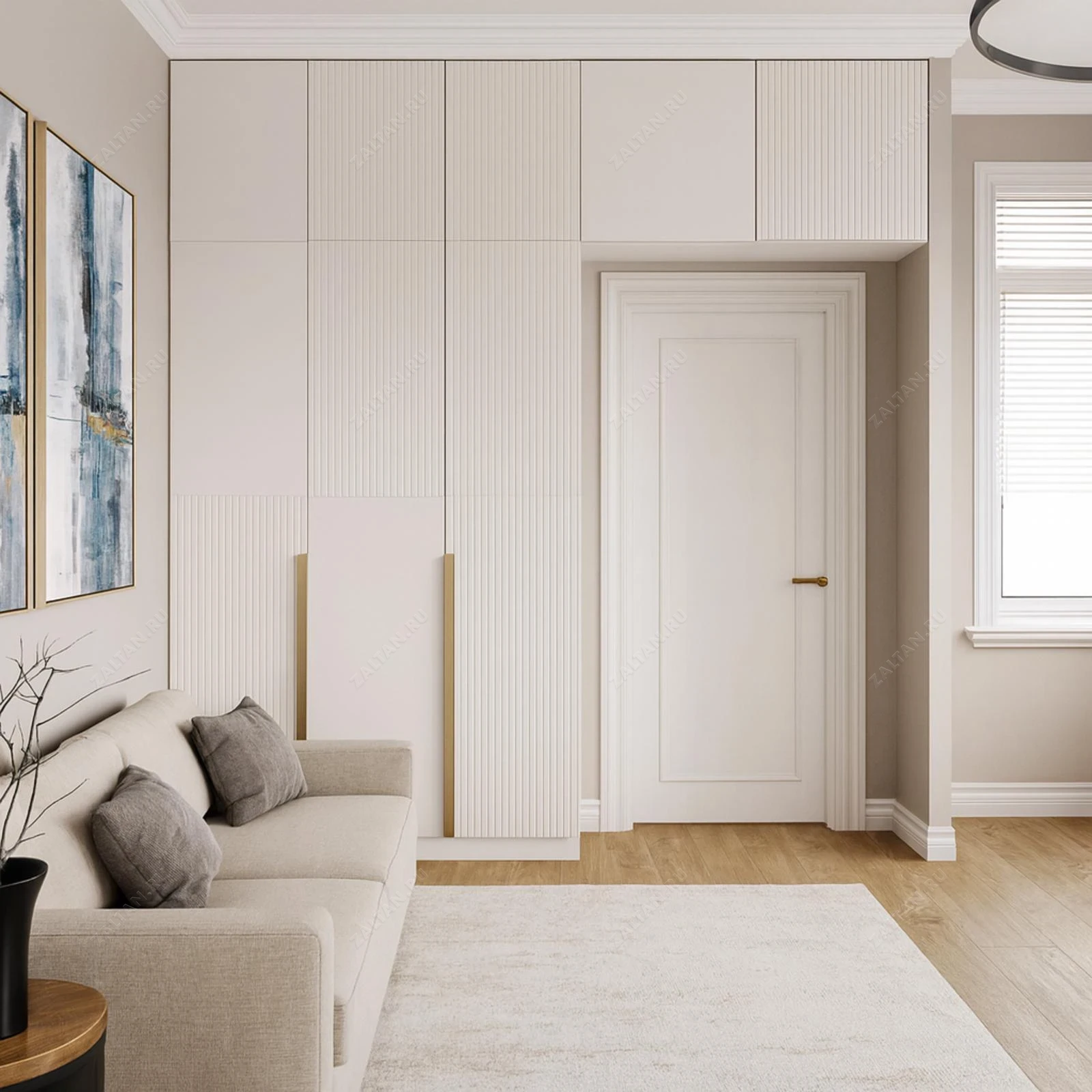 Элегантный встроенный шкаф вокруг дверного проёма, выполненный в светло-кремовой палитре с рифлёными реечными фасадами. Решение премиум-класса для прихожей: максимально использует высоту до потолка и визуально «спрятано» в нише.
