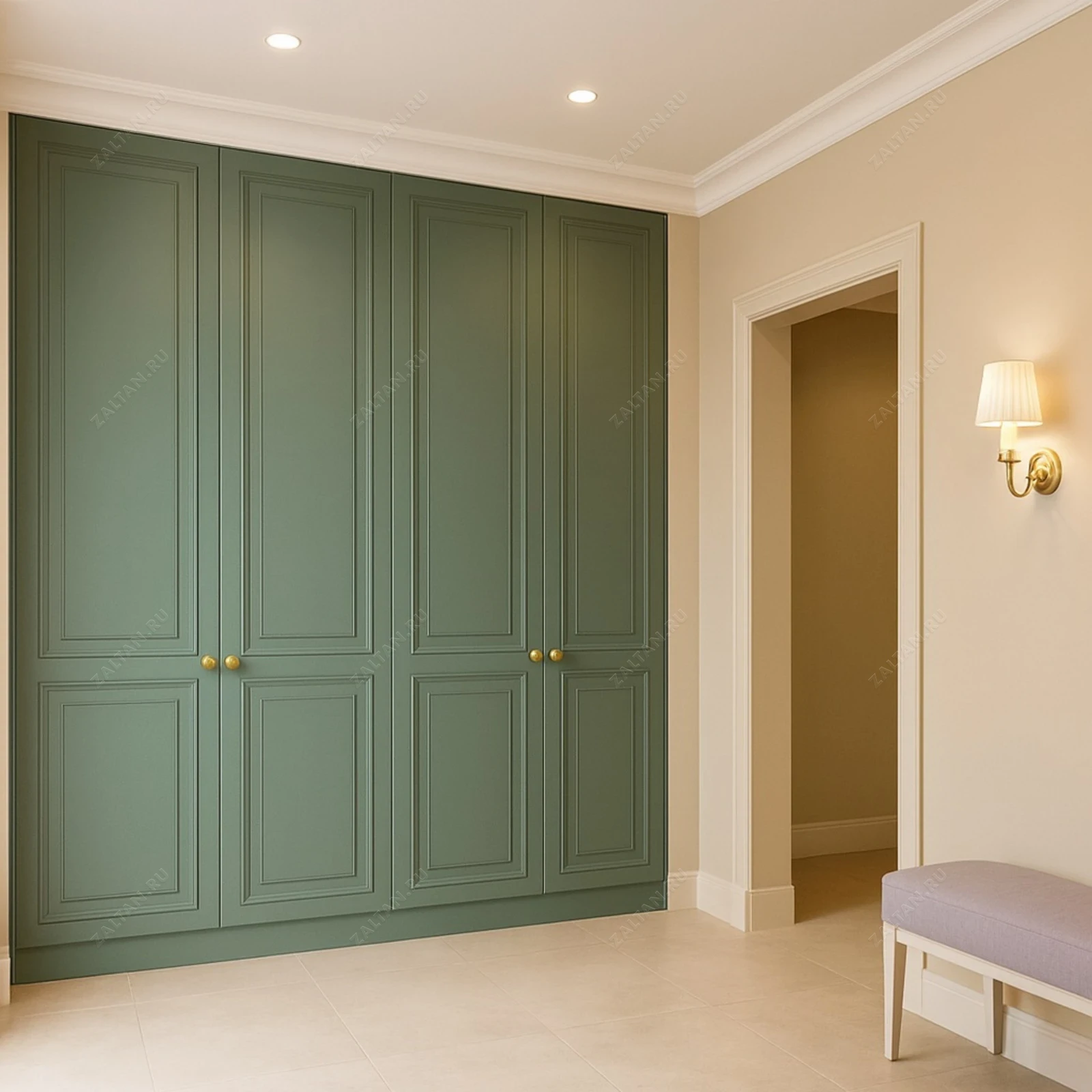 Встроенный четырехдверный шкаф в неоклассическом стиле — решение для тех, кто ценит аккуратную эстетику и продуманную функциональность. Фасады окрашены в глубокий зелёный тон, выполнены из МДФ с фрезеровкой и матовой эмалью. Внутреннее наполнение по индивидуальному проекту: полки, штанга, возможны антресоли и подсветка.