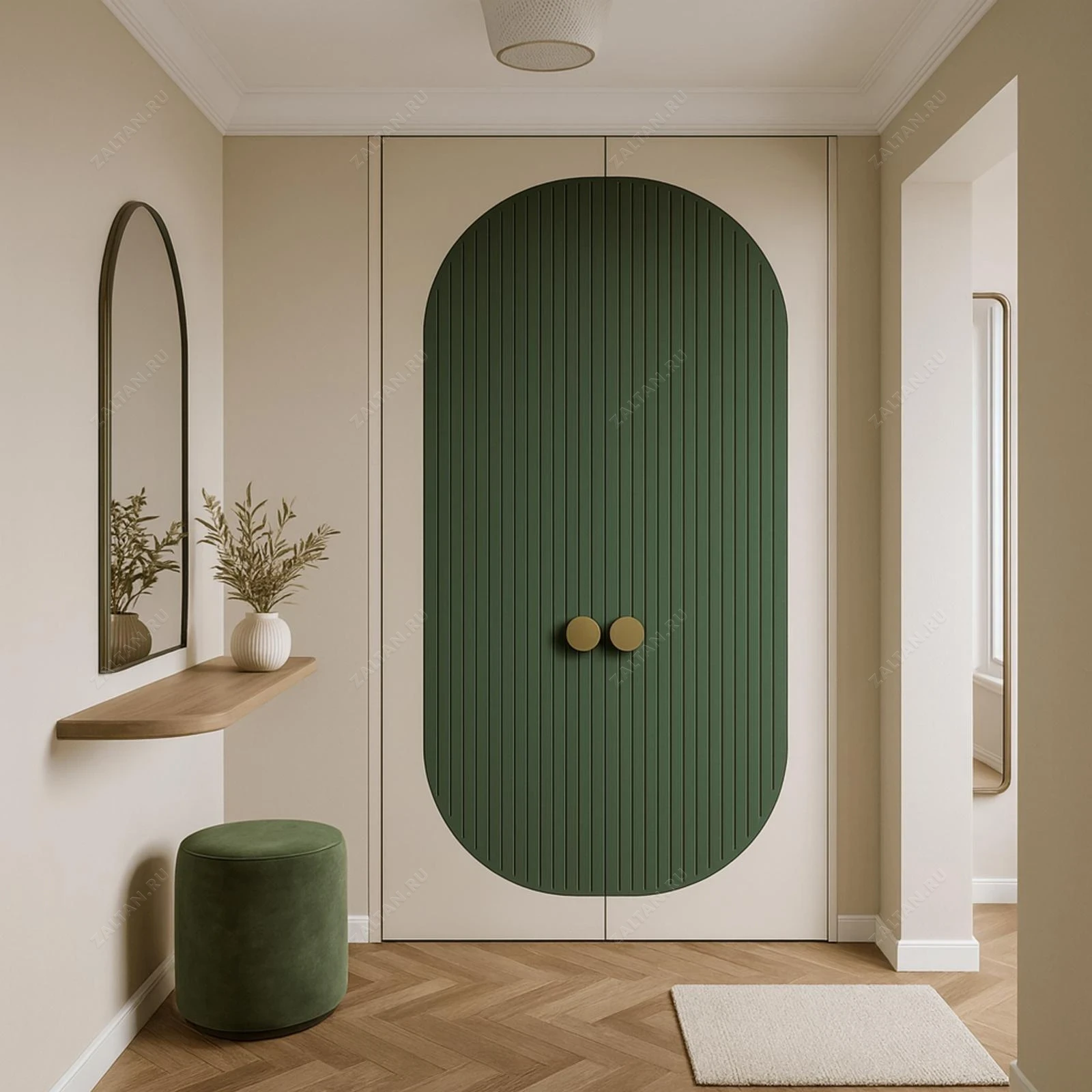 Встроенный шкаф для прихожей, выполнен на заказ с упором на премиум‑качество и индивидуальный подход. Фасад — реечная МДФ-панель зелёного цвета в матовом исполнении, окружён кремовой рамой. Декоративные латунные ручки добавляют элегантности.