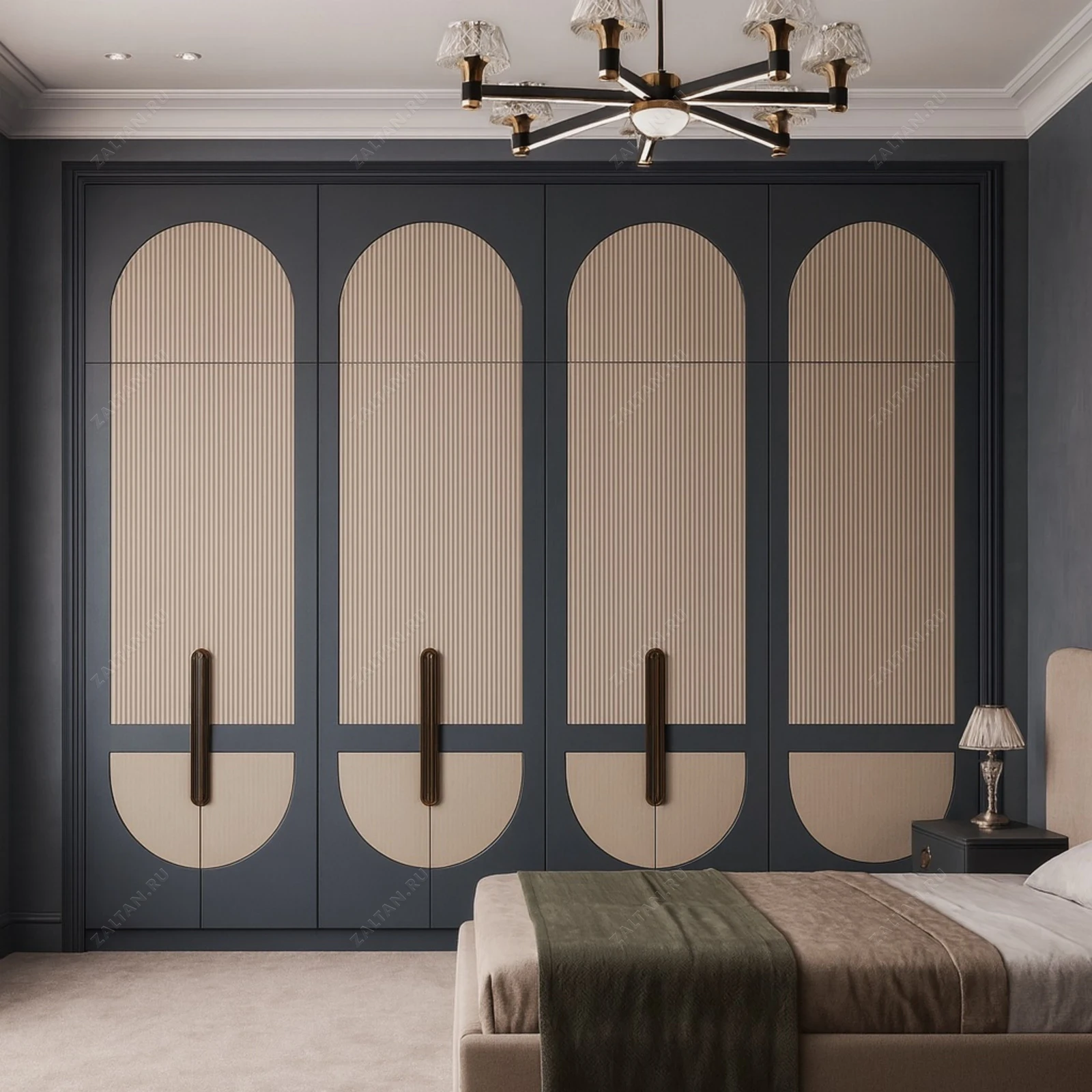 Элегантный встроенный шкаф премиум-класса с арочными фасадами и рифлёными вставками. Идеален для спальни: строгая тёмно-синяя рама в сочетании с тёплым бежевым рельефом создаёт спокойный, дорогой интерьер.