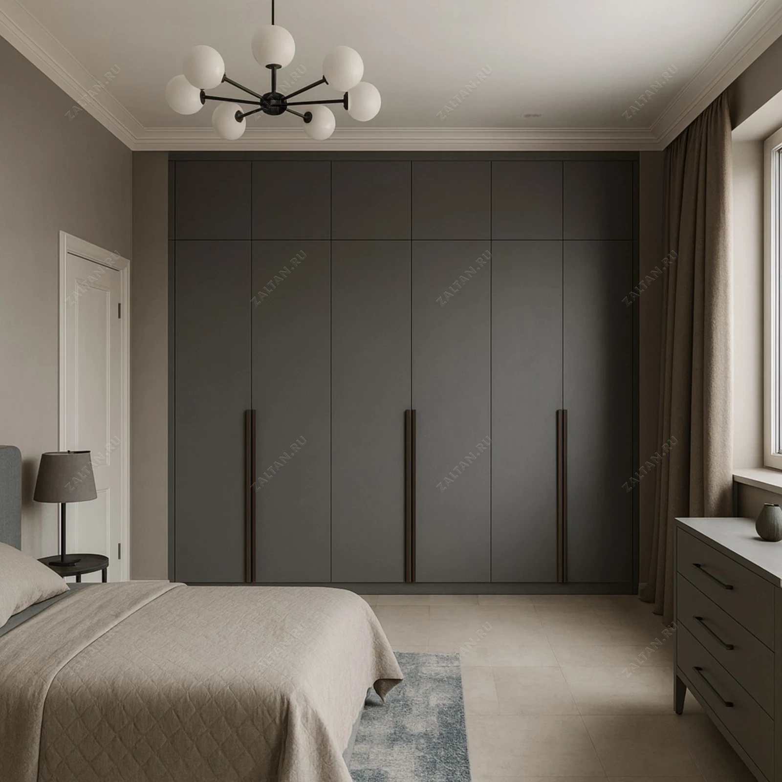 Встроенный шкаф премиум-класса в минималистичном решении. Матовые фасады из МДФ тёмно-серого тона, тонкие вертикальные ручки и скрытая верхняя линия создают спокойный, цельный образ.
