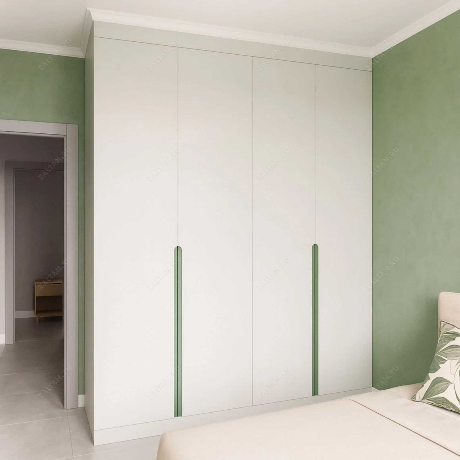 Элегантный встроенный шкаф под потолок, выполнен в минималистичной эстетике: ровные фасады белого матового тона с зелёной интегрированной ручкой-вертикалью. Идеально для спальни — занимает нишу, не загромождает пространство.