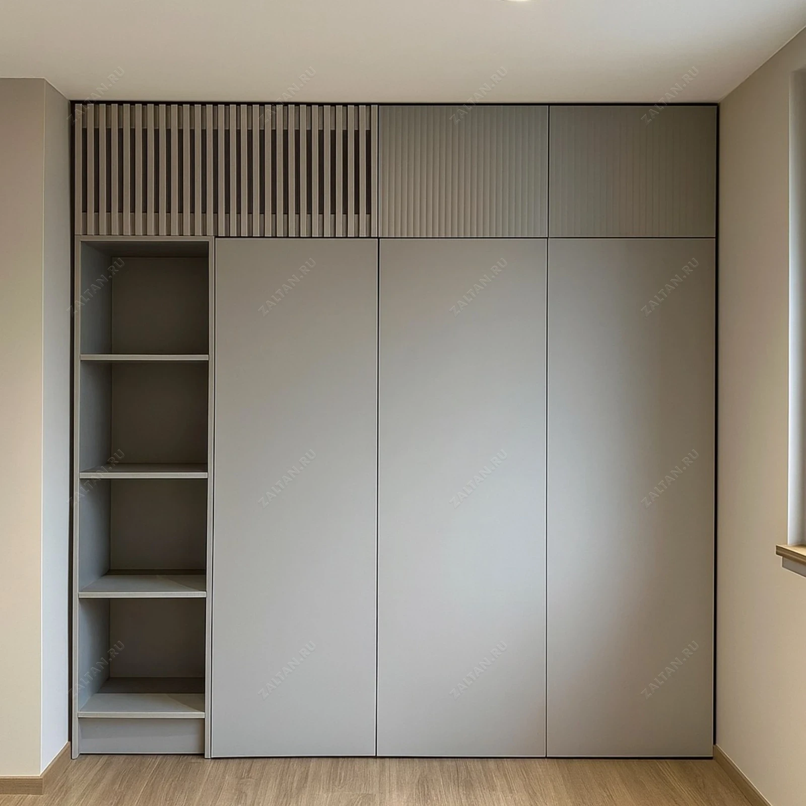 Встроенный шкаф-гардероб премиум-класса с лаконичными матовыми фасадами и декоративной реечной секцией наверху. Компактная открытая колонка-полки слева сочетает удобство доступа и декоративность. Изготовление по индивидуальным размерам, точная подгонка под нишу и качественная фурнитура — идеальный выбор для стильной спальни или прихожей.