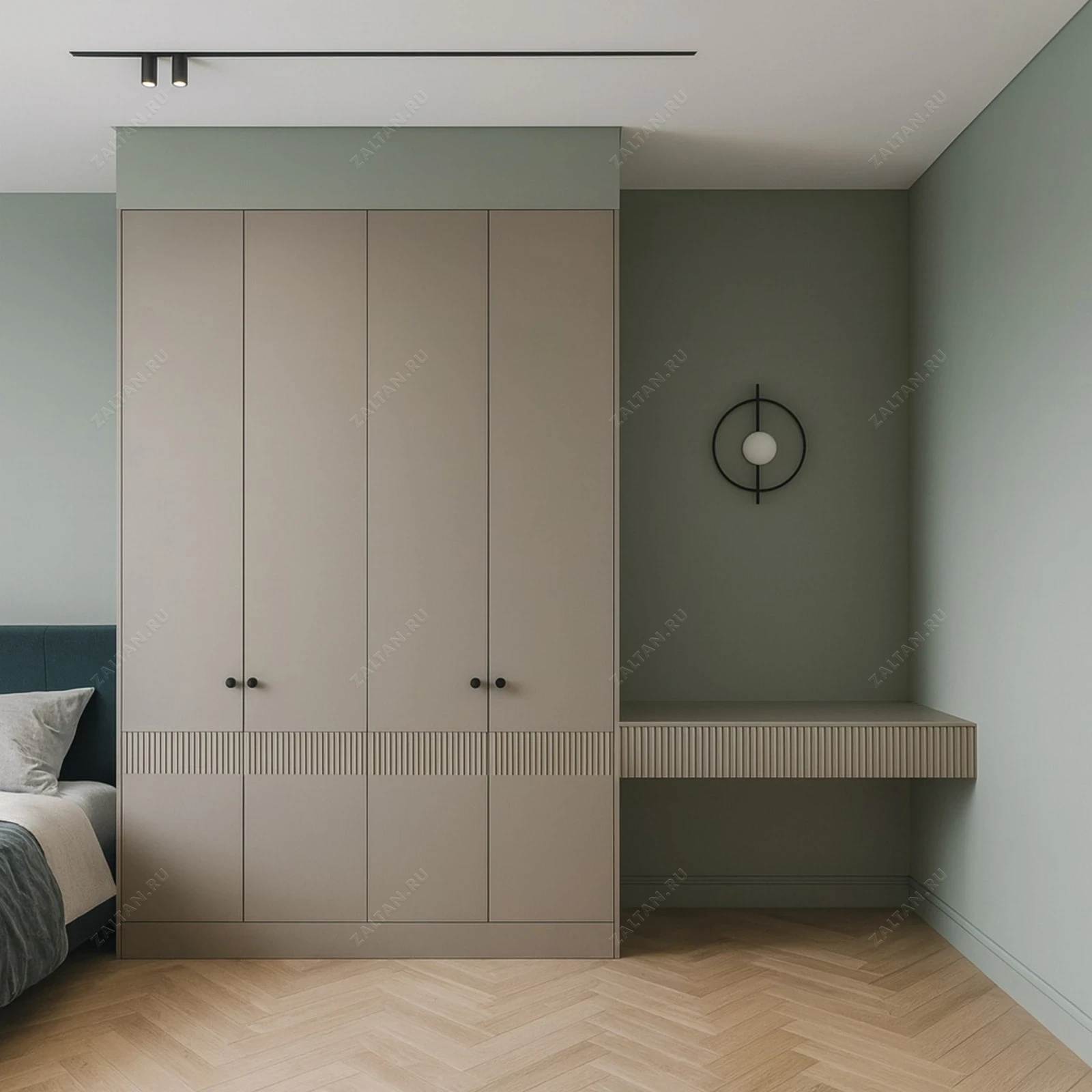 Встроенный шкаф-проект премиум-класса с интегрированной рабочей зоной и реечной фризовой отделкой. Выполнен до потолка, в лаконичном матовом тоне — аккуратно вписывается в интерьер спальни и сохраняет чистую минимальную линию фасада.