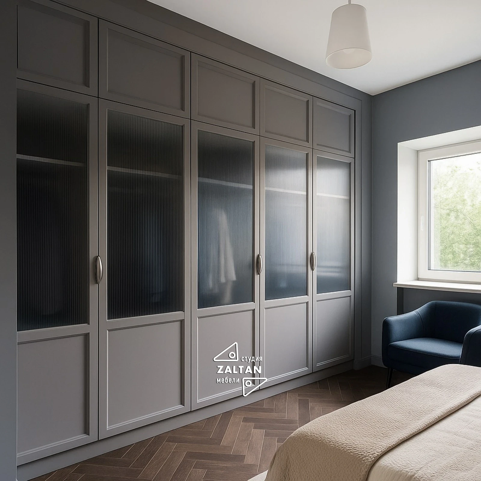 Встроенный платяной шкаф премиум-класса с мебельными филёнками и рифлёным стеклом в верхней части дверей. Чёткая классическая геометрия фасадов и матовая покраска подчёркивают текстуру и глубину цвета.