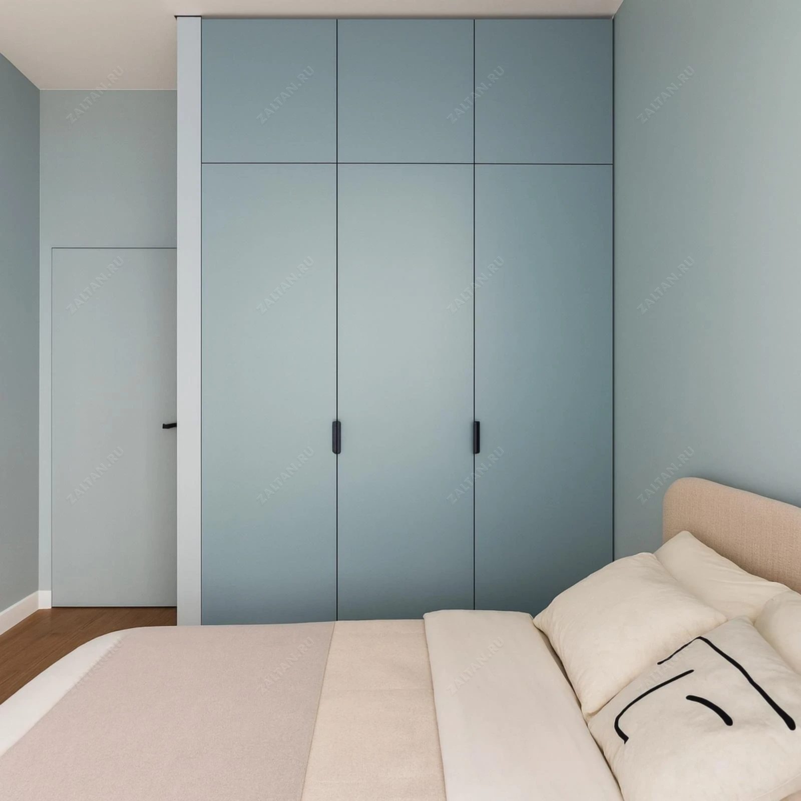 Элегантный встроенный шкаф до потолка в спокойном голубом оттенке — решение для ценителей минимализма и качественной мебели. Плоские фасады из МДФ с матовой покраской и аккуратными черными ручками подчеркивают сдержанный скандинавский характер.