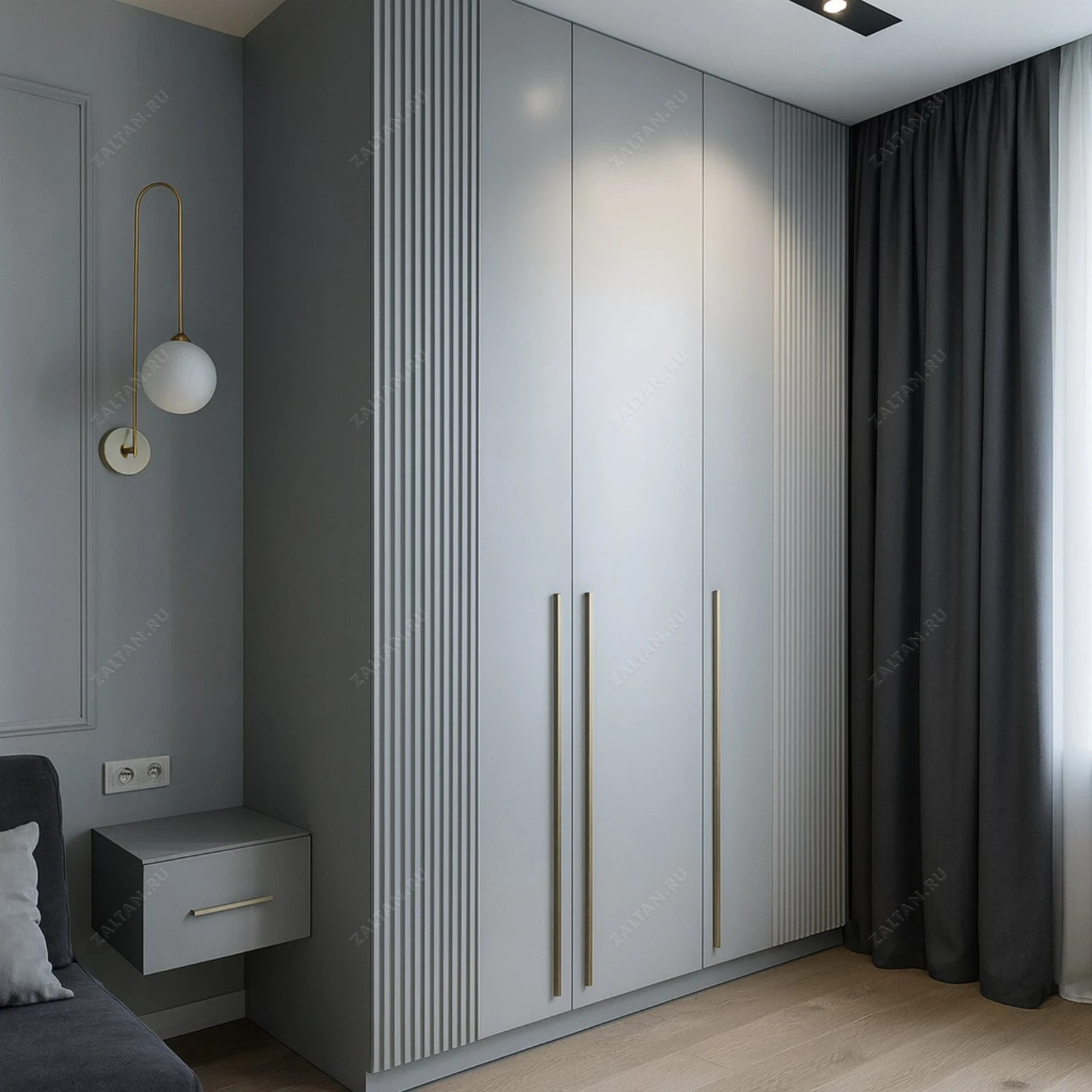 Элегантный встроенный шкаф в стиле минимализм — решение для тех, кто ценит чистые линии и премиальное исполнение. Фасад с реечным декором и длинными металлическими ручками подчёркивает вертикальность и визуально увеличивает высоту комнаты.