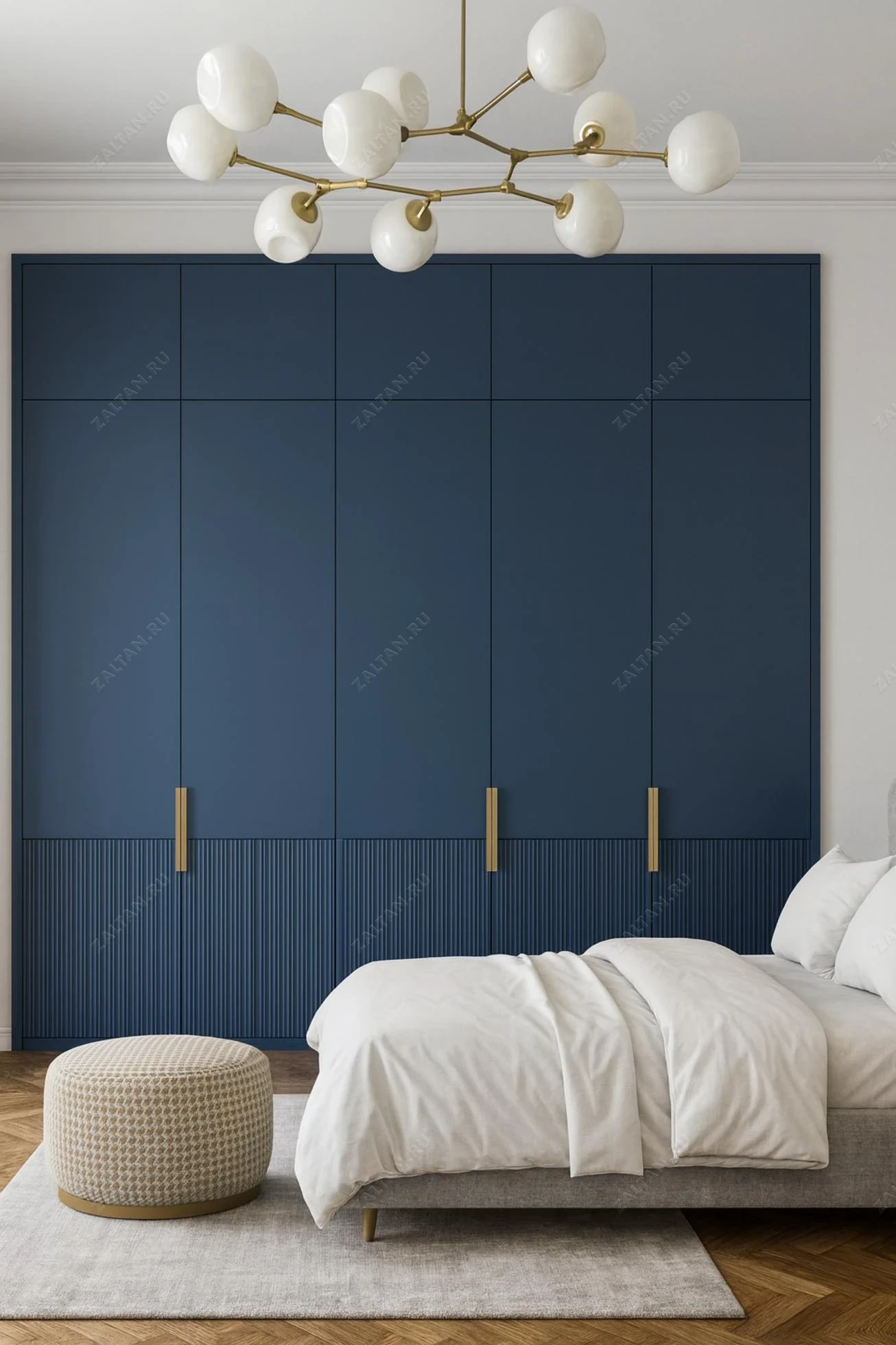 Элегантный встроенный шкаф премиум-класса в современном стиле. Идеальное решение для спальни — лаконичная вертикальная фактура нижней панели и гладкие фасады сверху создают сдержанную, но выразительную композицию.