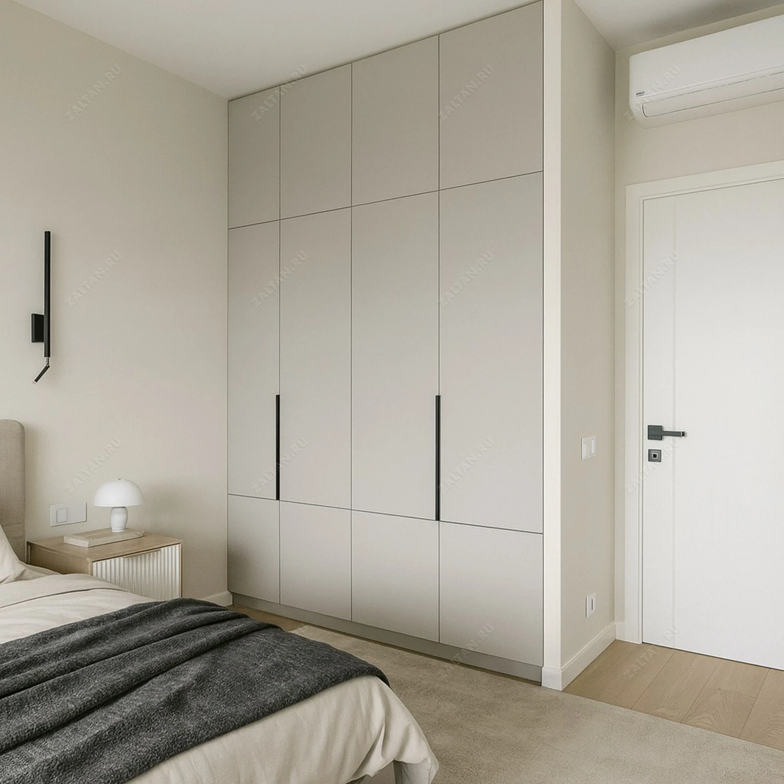 Качественный встроенный шкаф в спальню — премиальная мебель под индивидуальный размер. Акцент на лаконичном минималистичном фасаде в кремовом тоне и длинных чёрных ручках, которые подчёркивают стройность конструкции.