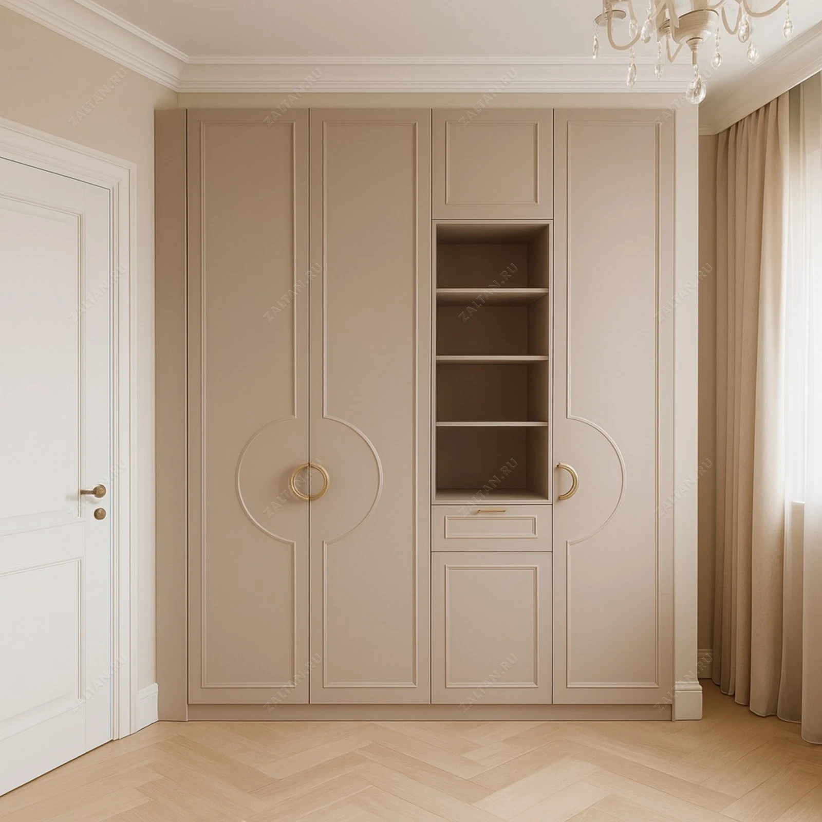 Встроенный шкаф в неоклассическом ключе, выполнен из окрашенного МДФ с аккуратными филёнками и матовой эмалью. Центральная секция с открытыми полками и выдвижным ящиком добавляет декоративности и удобства.