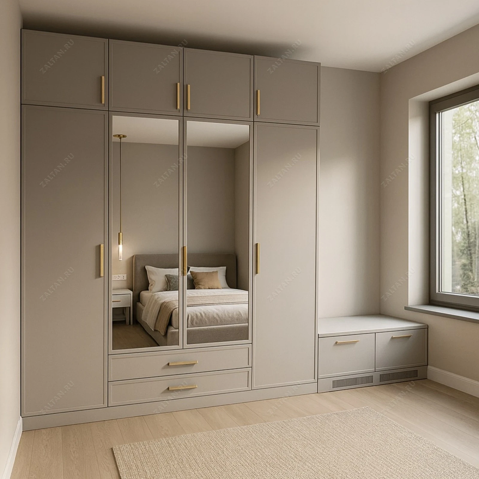 Элегантный встроенный шкаф до потолка в спокойной бежевой гамме. Продуманная внутренняя планировка с антресолями, двумя зеркальными дверями и выдвижными ящиками — оптимальное решение для спальни премиум-класса.