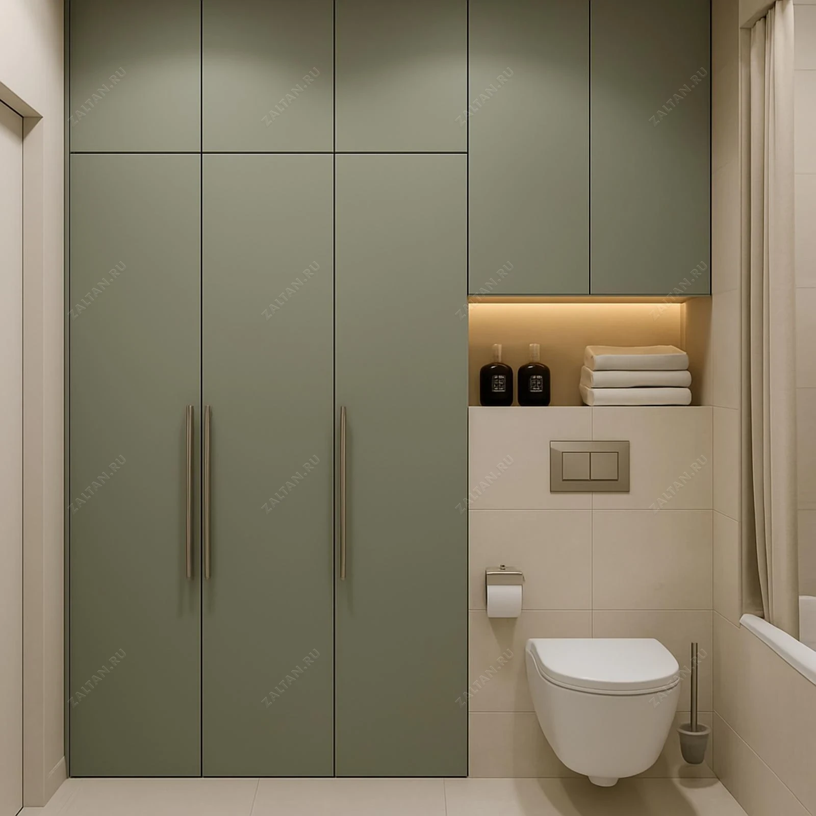 Встроенный шкаф в ванную комнату — премиальное мебельное решение по индивидуальным размерам. Компактная, но вместительная конструкция с антресолью и нишей с подсветкой для полотенец и мелких аксессуаров.