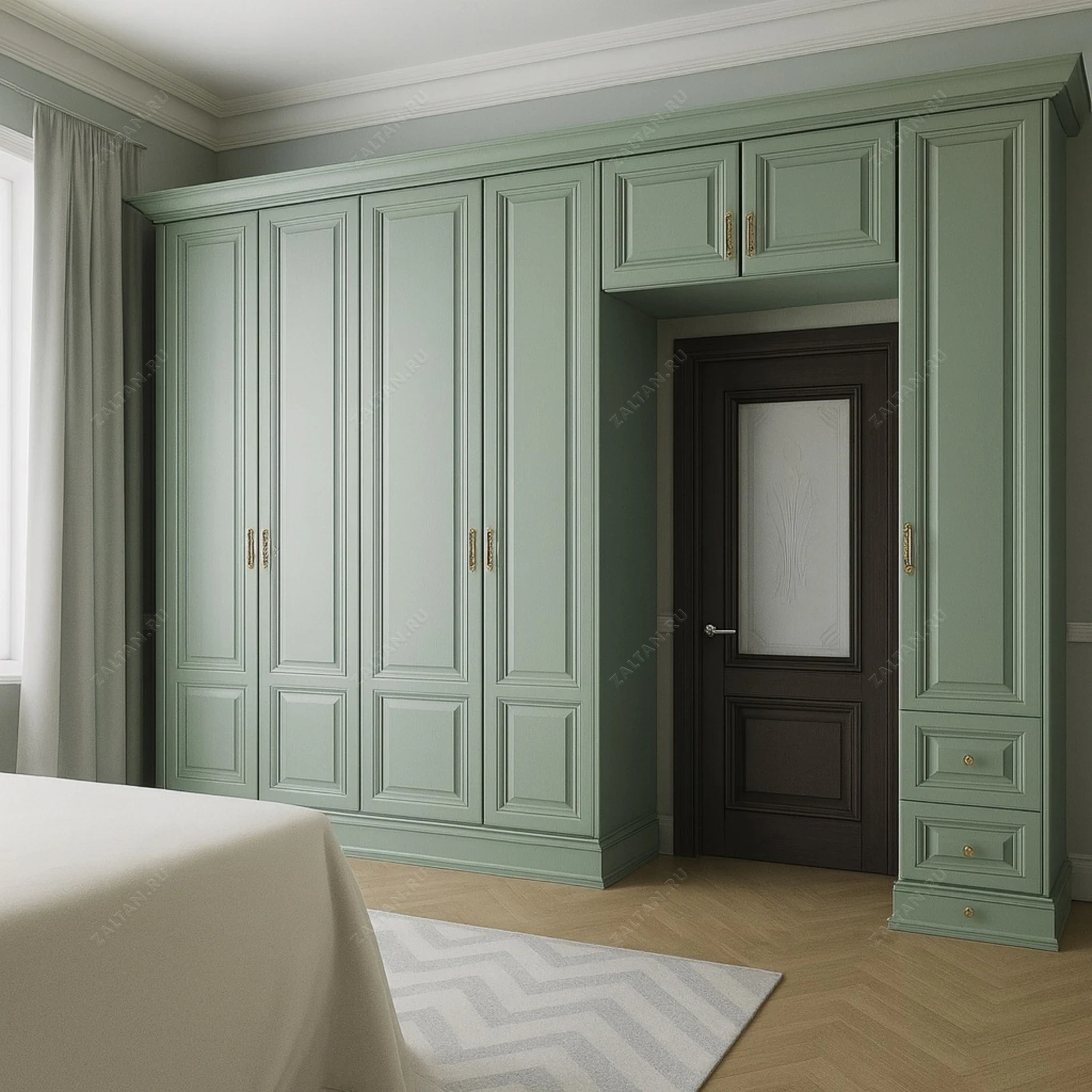 Встроенный шкаф-пенал вокруг дверного проёма в неоклассическом стиле. Изготовлен по индивидуальным размерам с фрезерованными МДФ-фасадами и матовой эмалью, декоративным карнизом и цоколем. Компактно использует нишу вокруг двери, сочетая платяные секции, антресоли и выдвижные ящики.