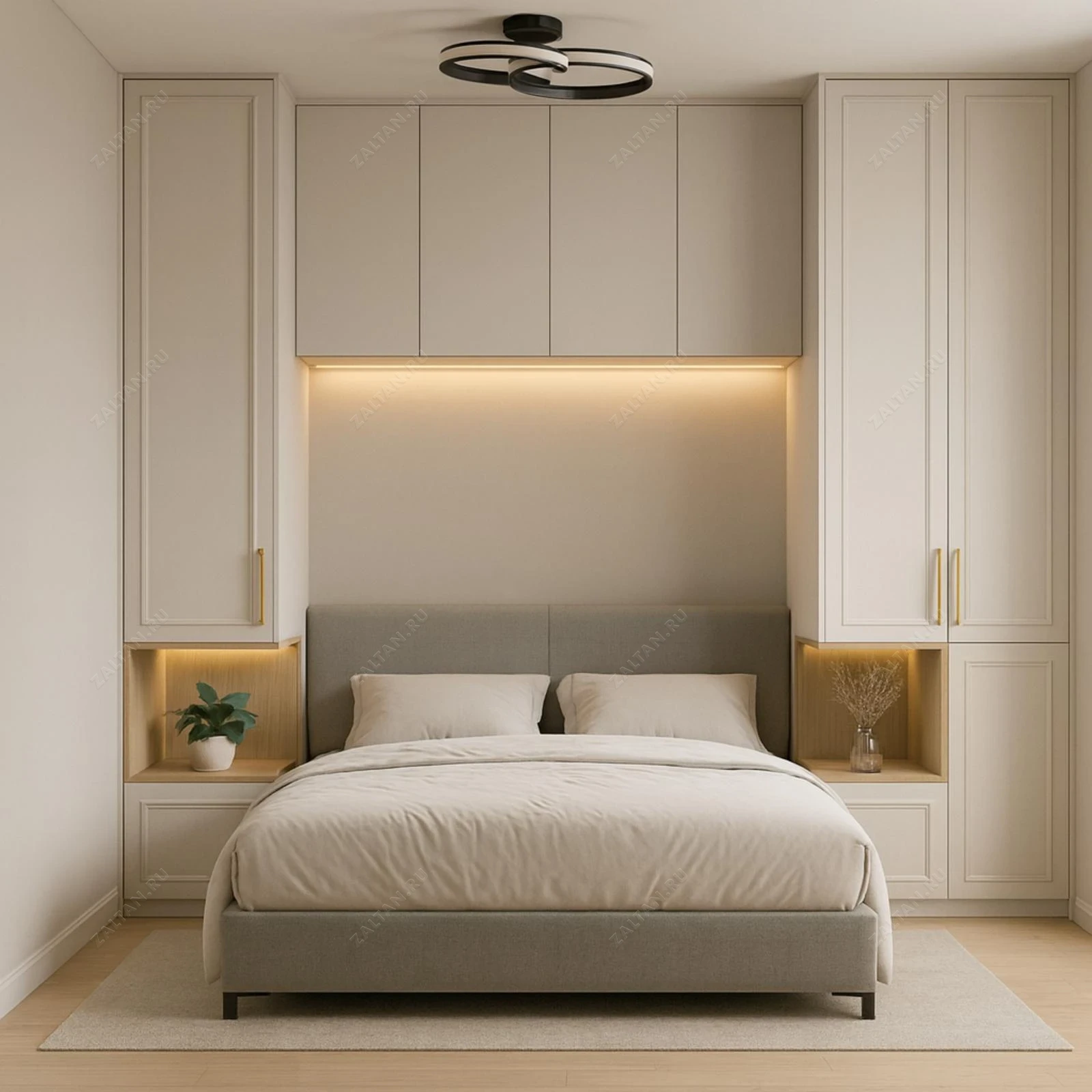 Встроенная мебельная композиция вокруг кровати — элегантное и функциональное решение для спальни. Индивидуальное изготовление обеспечивает точную подгонку по размерам и высокое качество отделки. Зона включает высокие шкафы, антресоли и открытые ниши с подсветкой.