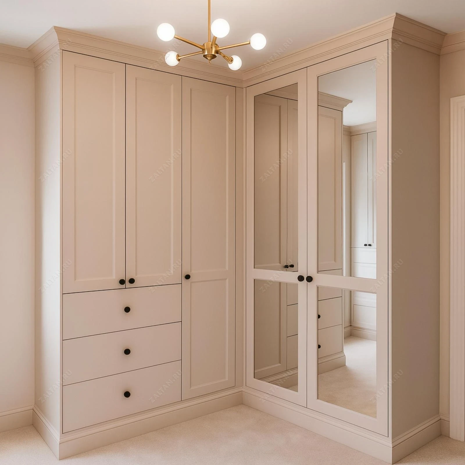 Элегантный встроенный угловой шкаф в неоклассическом стиле — решение для спальни или гардеробной. Выполнен из МДФ с матовой эмалью в кремовом тоне, оснащён зеркальными фасадами и аккуратными фрезерованными рамками.