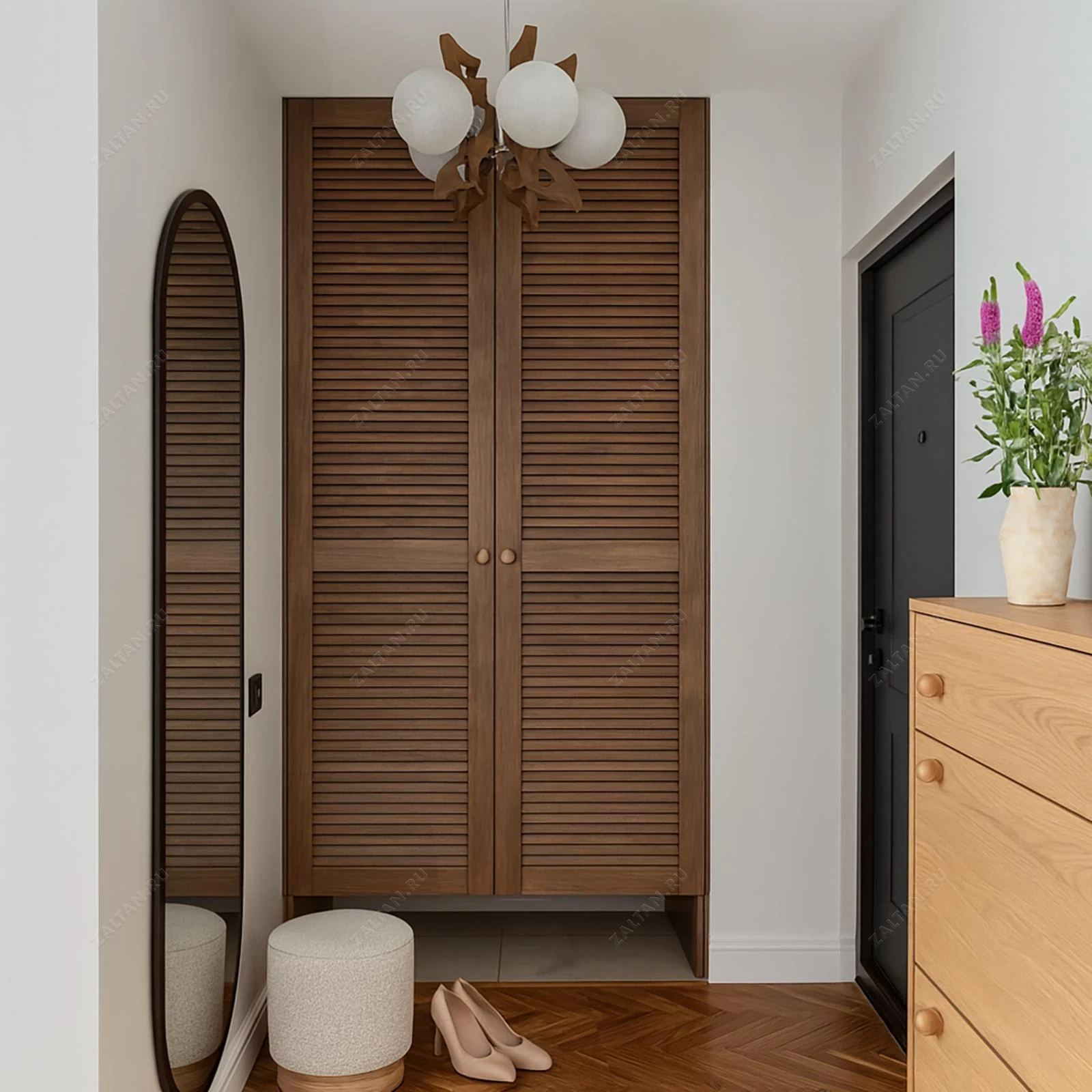Жалюзийный шкаф в прихожую — изготовление под заказ с акцентом на премиальное качество и продуманную эргономику. Компактный высокий корпус с распашными ламелевыми дверцами экономит пространство и обеспечивает вентиляцию внутри.